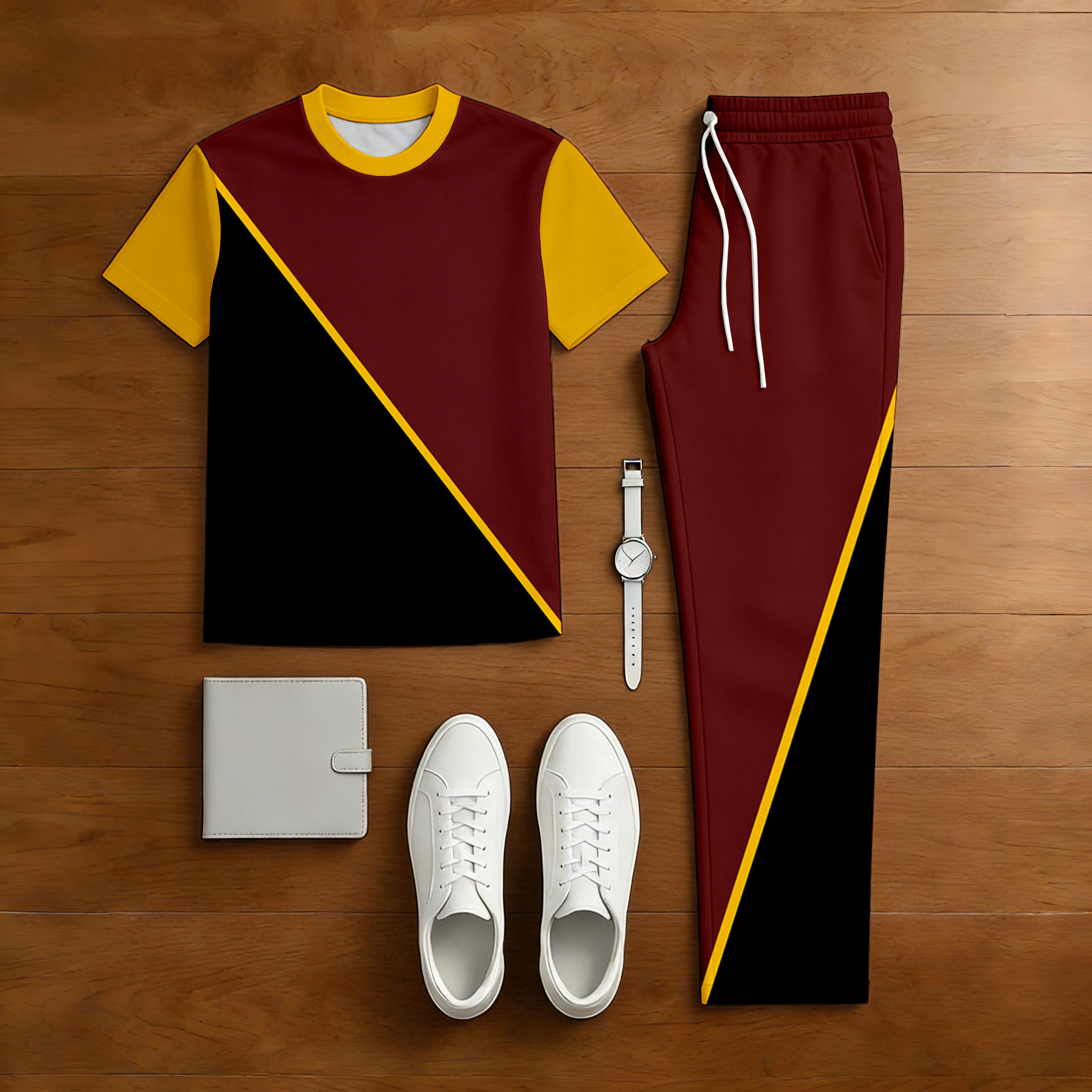 Men's Casual Black & Maroon Color Matching Geometric Printed Short Sleeved T-Shirt & Trousers Two-Piece Set