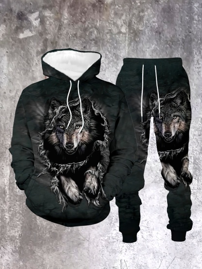 Men's Casual "Wolf" Printed Hoodies Long Sleeved Sweatshirts & Sweatpants Two-Piece Set
