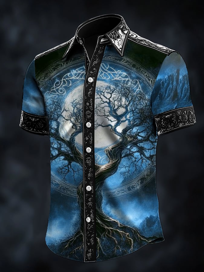 Men's Casual Dark Viking Tree Of Life Print Satin Shirt