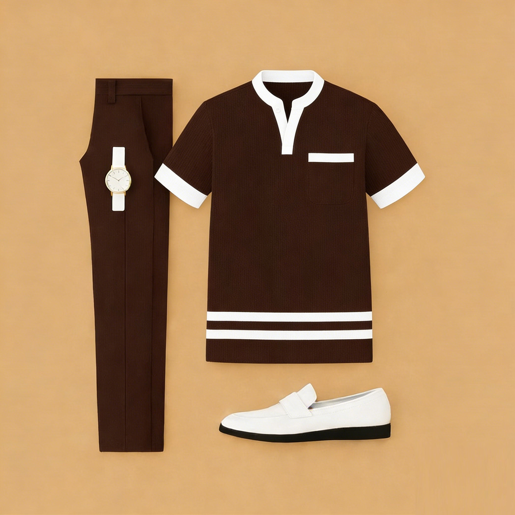 Men's Casual Deep Coffee Color Matching Printed Short Sleeved Henry Collar T-Shirt & Trousers Two-Piece Set