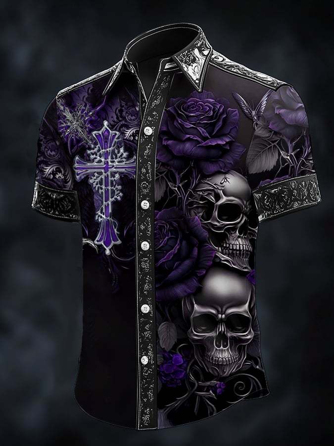 Men's Casual Fashion Dark Pattern Cross Crow Contrast Satin Shirt