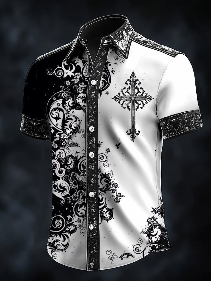 Men's Casual Fashion Dark Pattern Cross Crow Contrast Satin Shirt