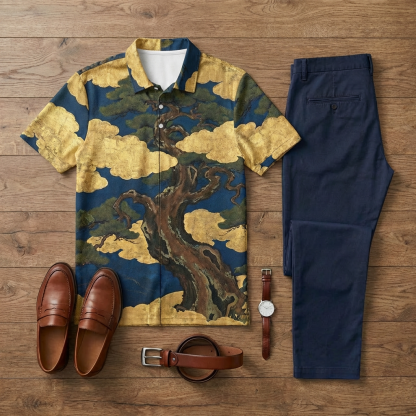 Men's Casual Japanese Cuban Style Printed Short-Sleeve Polo Shirt And Trousers Two-Piece Set