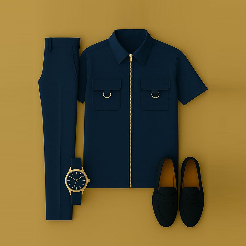 Men's Casual Navy Blue Short Sleeved Zipper Lapel Collar Shirt & Trousers Two-Piece Set