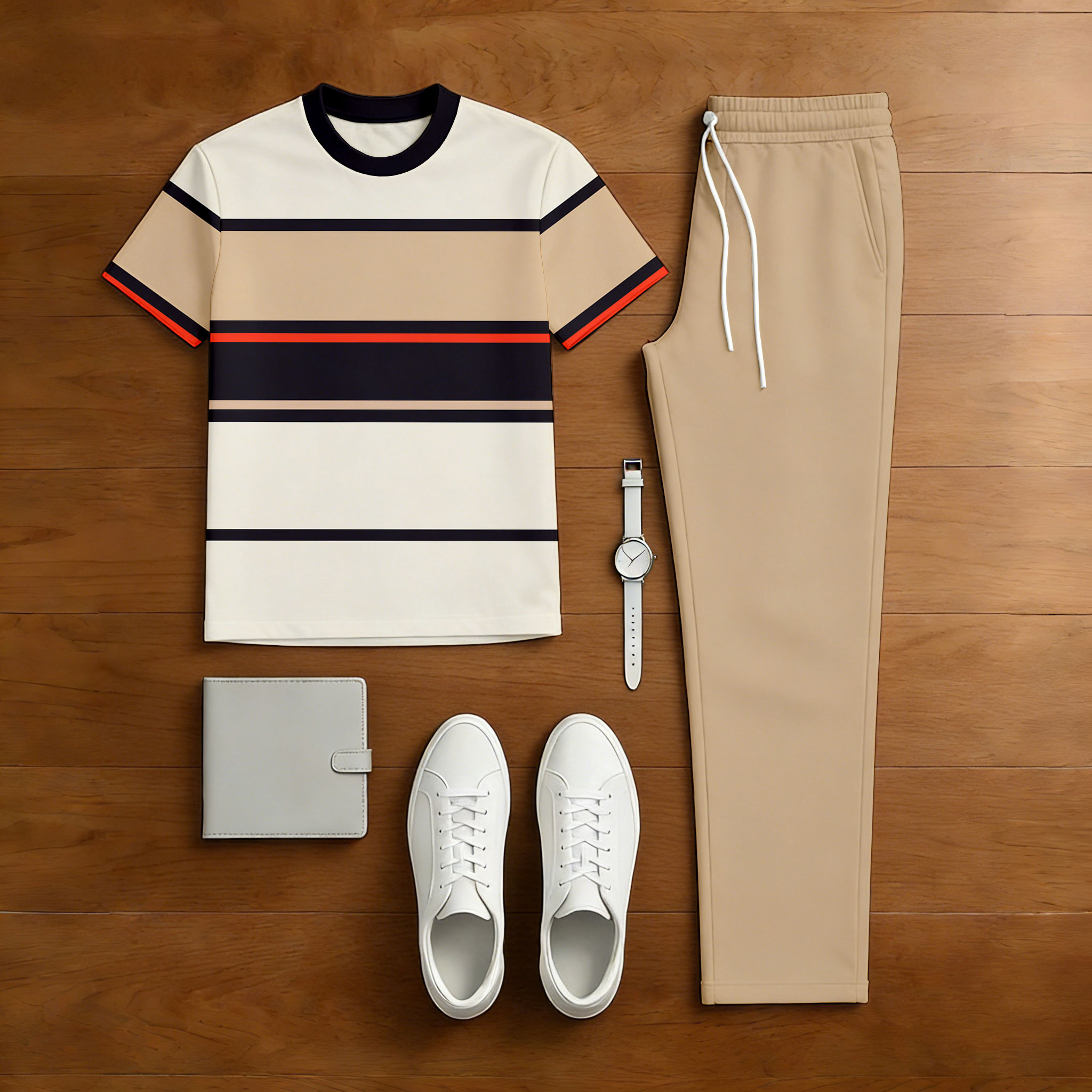 Men's Casual Tan & Beige Color Matching Striped Printed Short Sleeved T-Shirt & Trousers Two-Piece Set