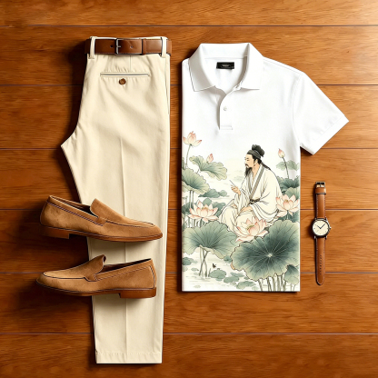 Men's Casual White Lotus Printed Short-Sleeve Polo Shirt And Trousers Two-Piece Set