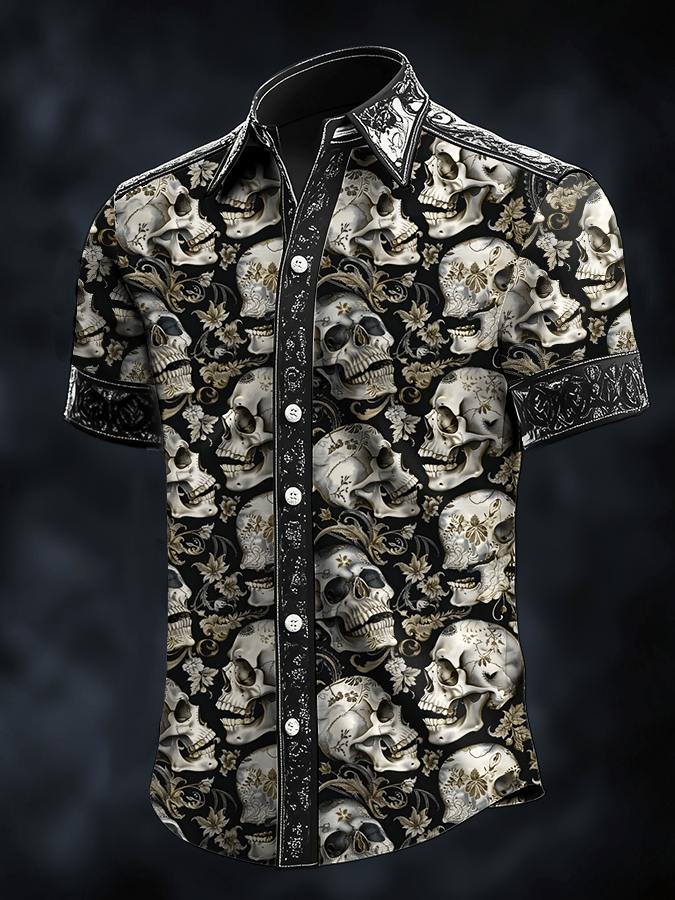 Men's Dark Skull Print Satin Short Sleeve Shirt