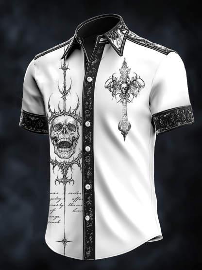 Men's Dark Skull Print Satin Short Sleeve Shirt