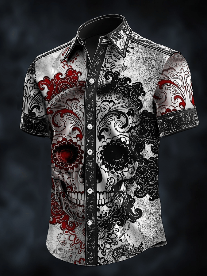 Men's Dark Skull Print Satin Short Sleeve Shirt