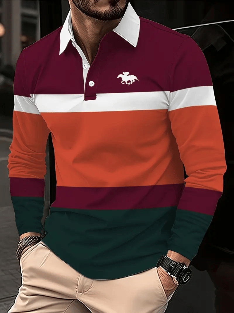 Men's Retro Business Stripe Print Long Sleeve Polo Shirt