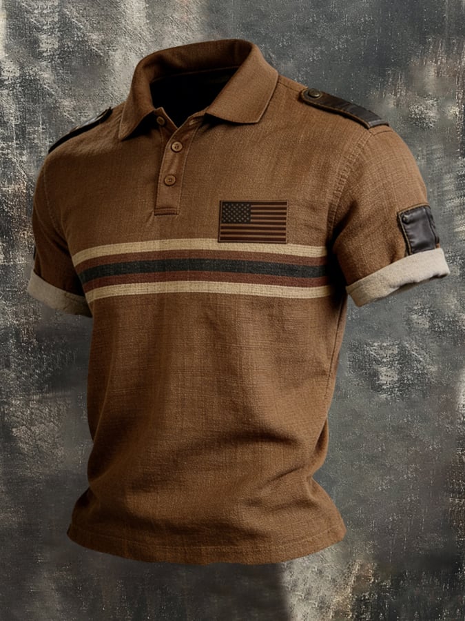 Men'S Retro Color-Block "Patriot" Polo-Collar Casual Cotton-Linen T-Shirt