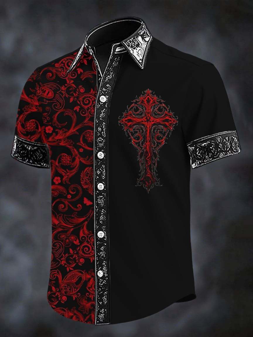 Men's Retro Gothic Cross Print Short Sleeve Shirt