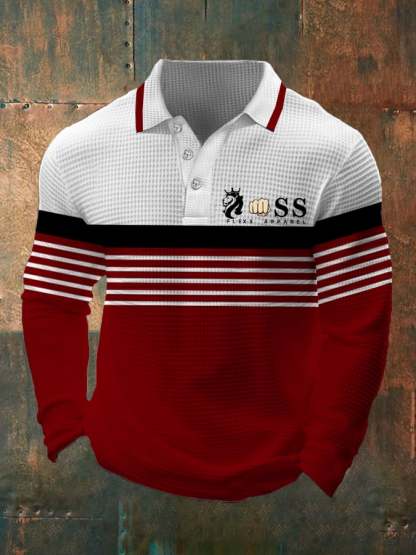 Men's Retro Letter Design Waffle Fabric Long Sleeve Polo Shirt