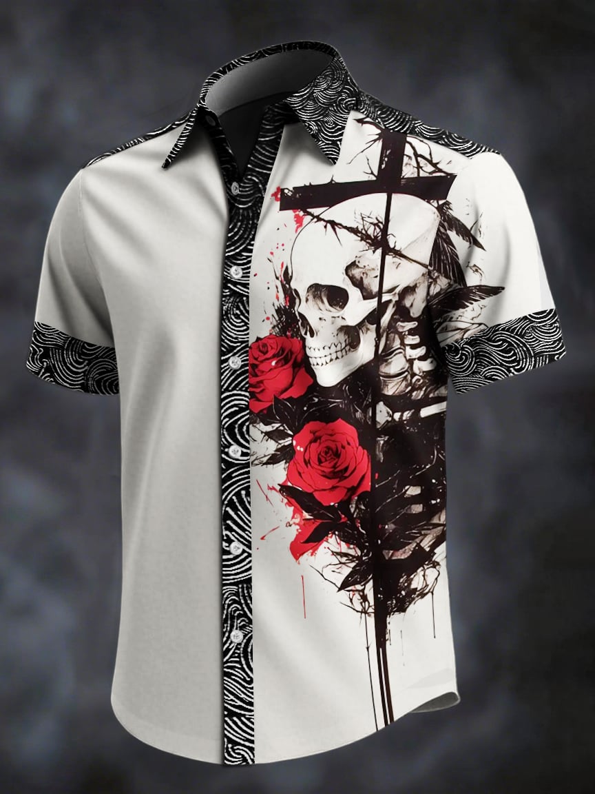 Men's Retro Skull Print Lapel Short Sleeve Shirt