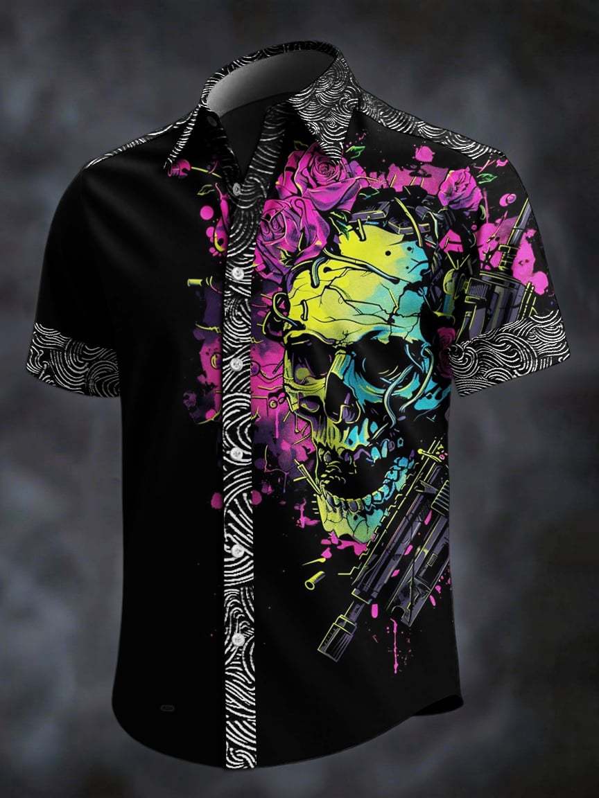Men's Retro Skull Print Lapel Short Sleeve Shirt