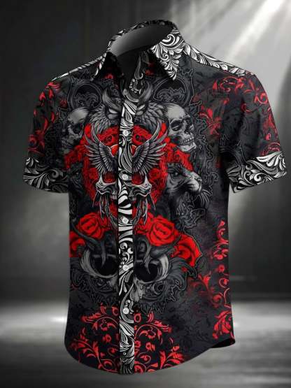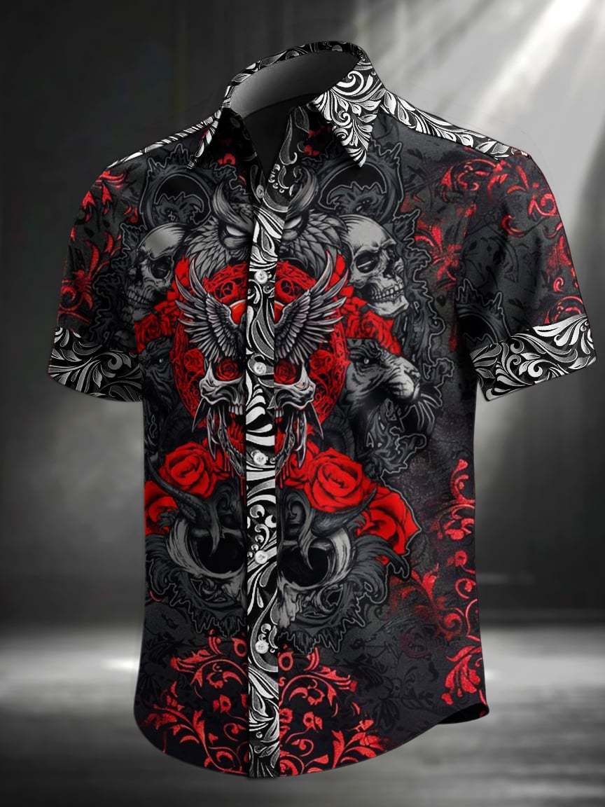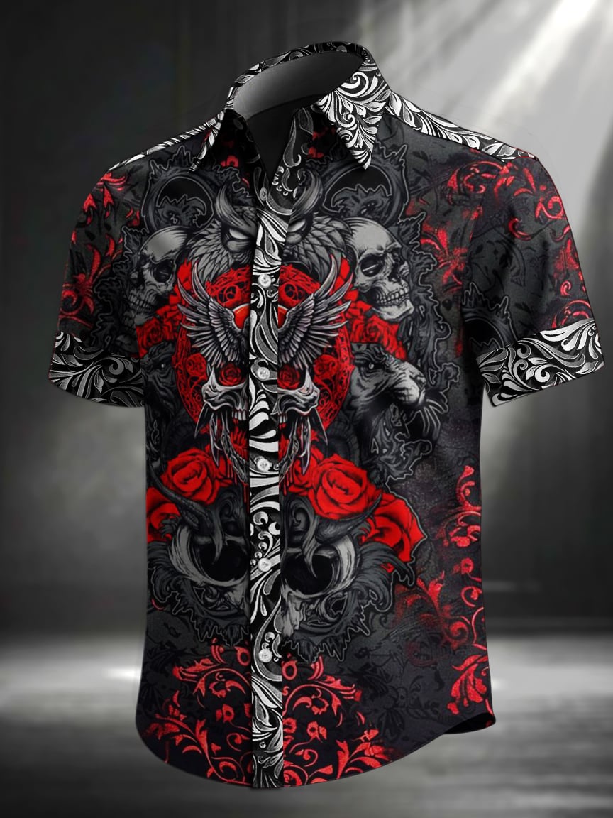 Men's Retro Skull Print Lapel Short Sleeve Shirt