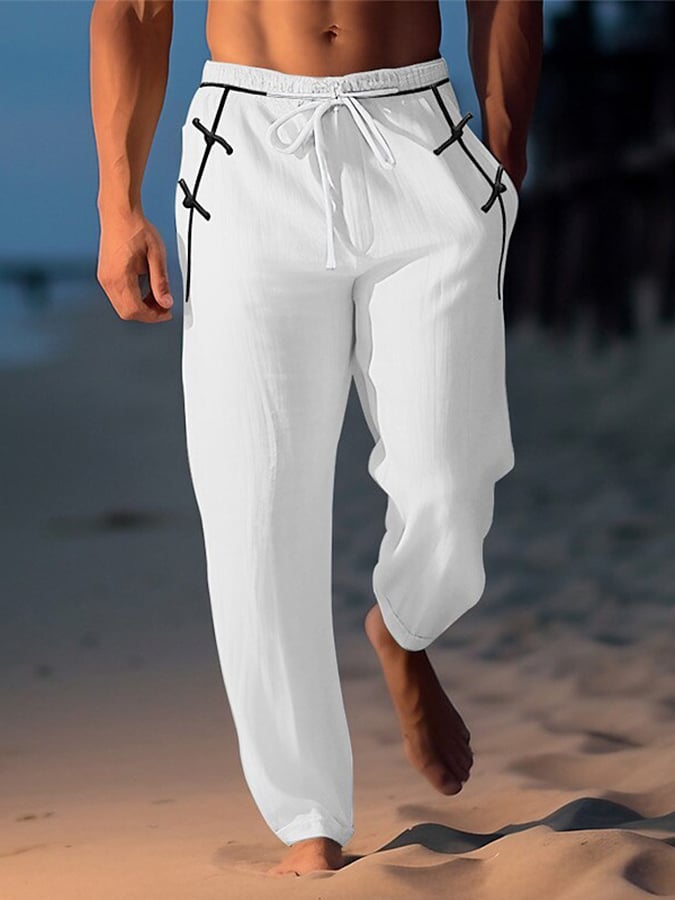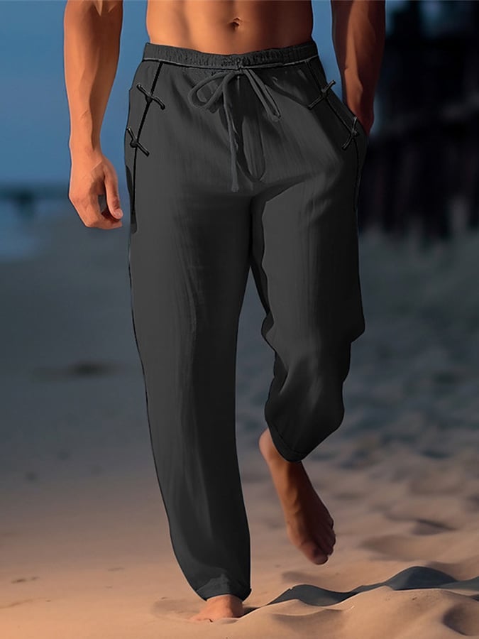 Men's Retro Solid Color Design Elastic Waist Lace-Up Casual Pants