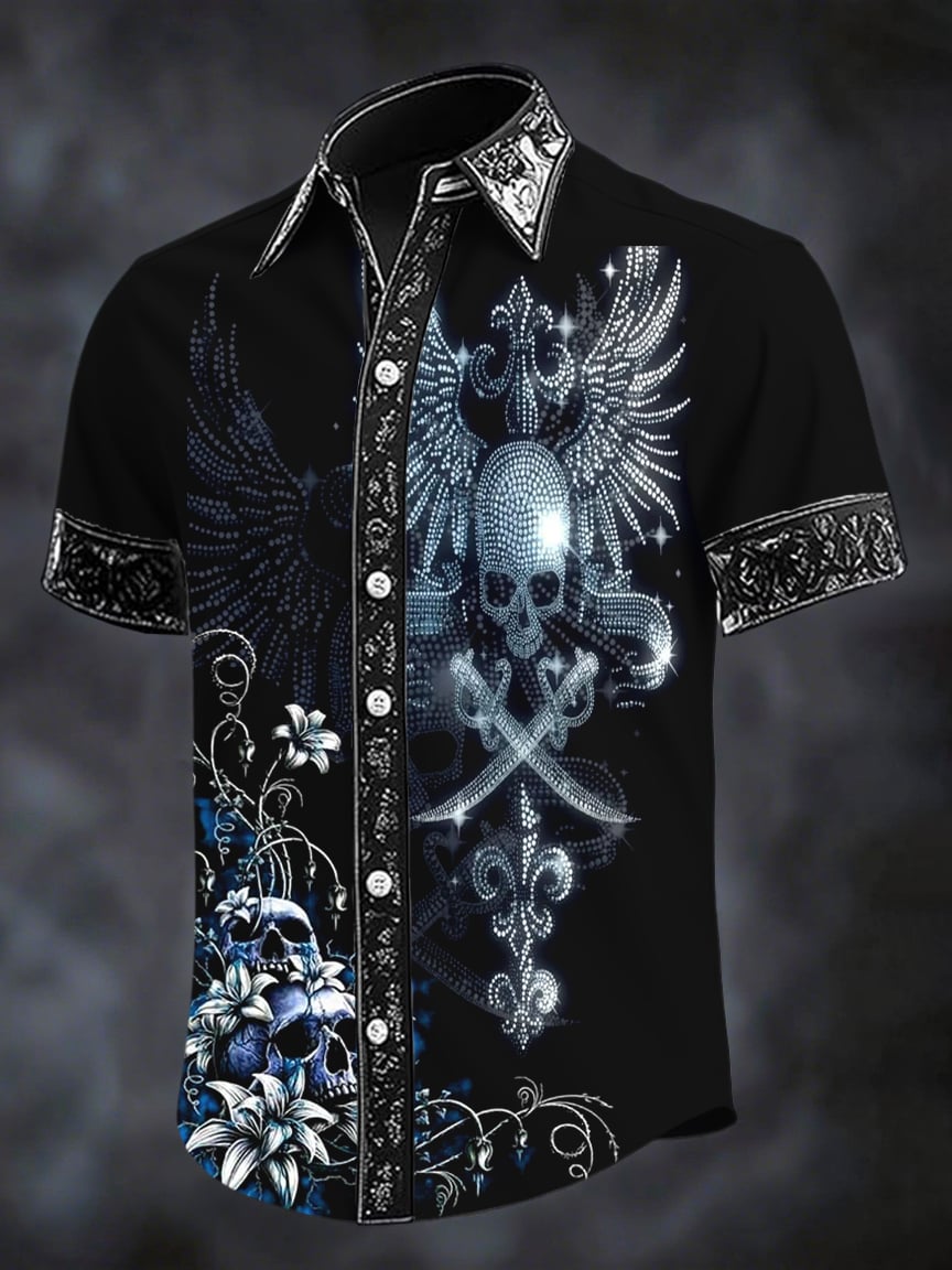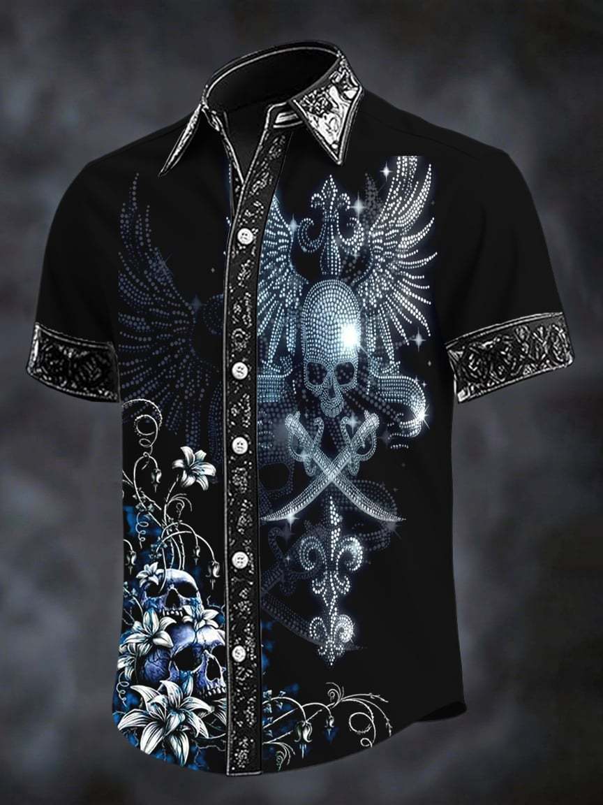 Men's Retro Western Skull Vine Print Short Sleeve Shirt