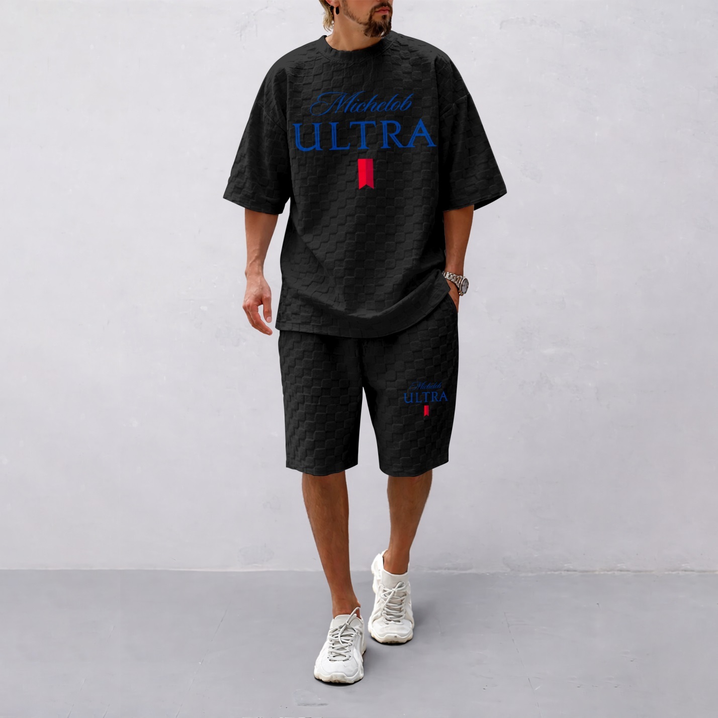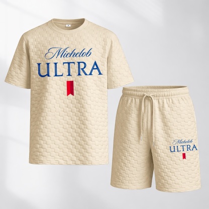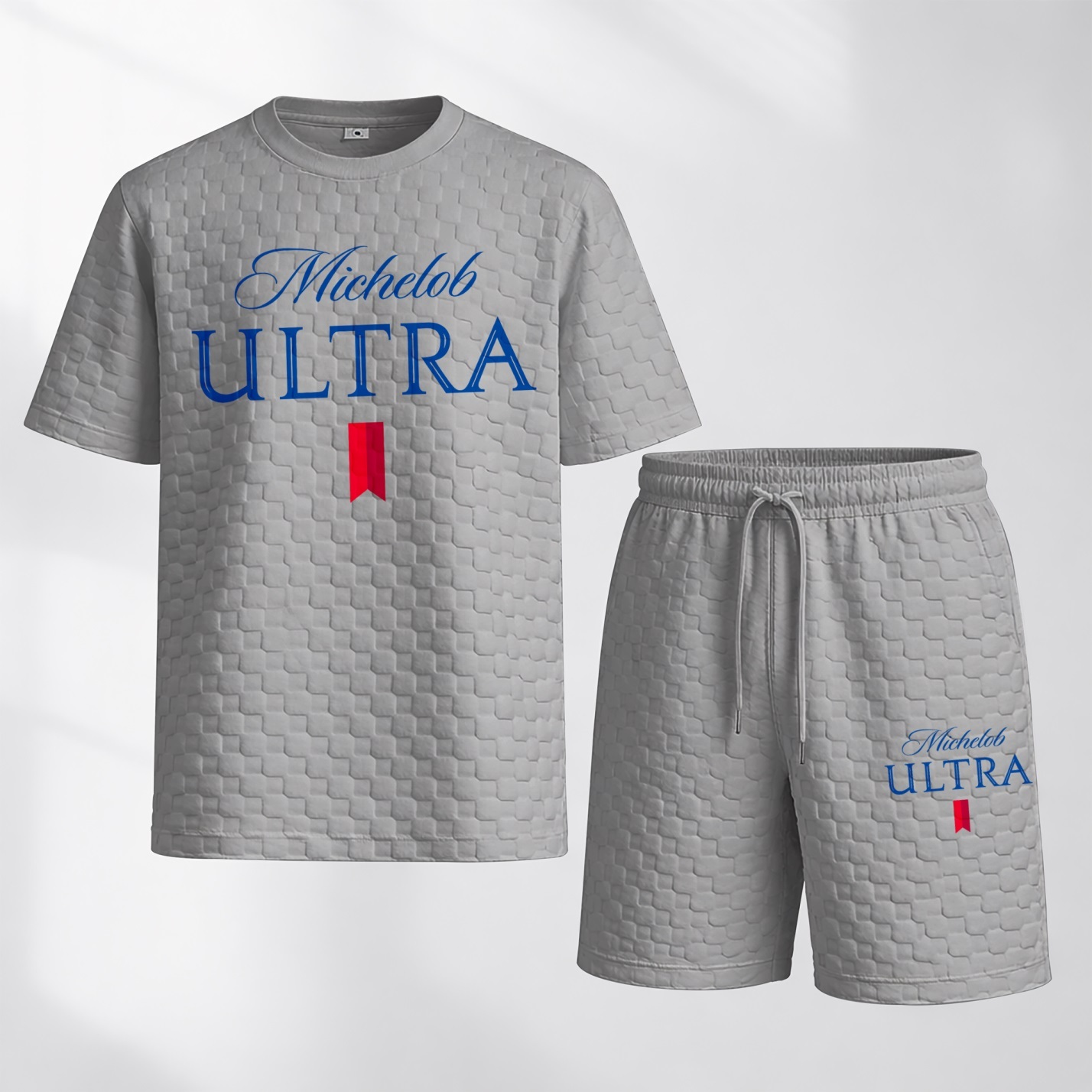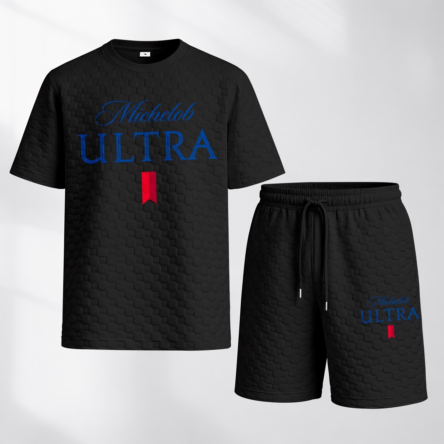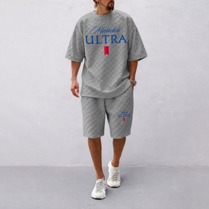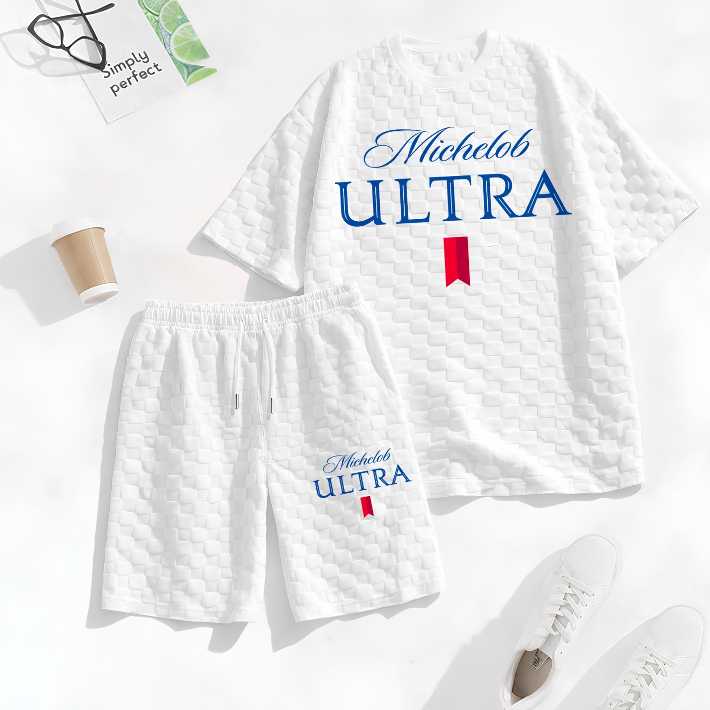 Men's Spring/Summer Drawstring Shorts Set featuring Beverage-Print Plaid Fabric—A casual summer ensemble comprising a short-sleeve shirt and shorts, ideal for both daily wear and athletic activities