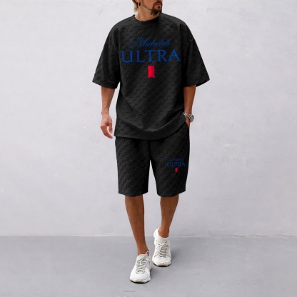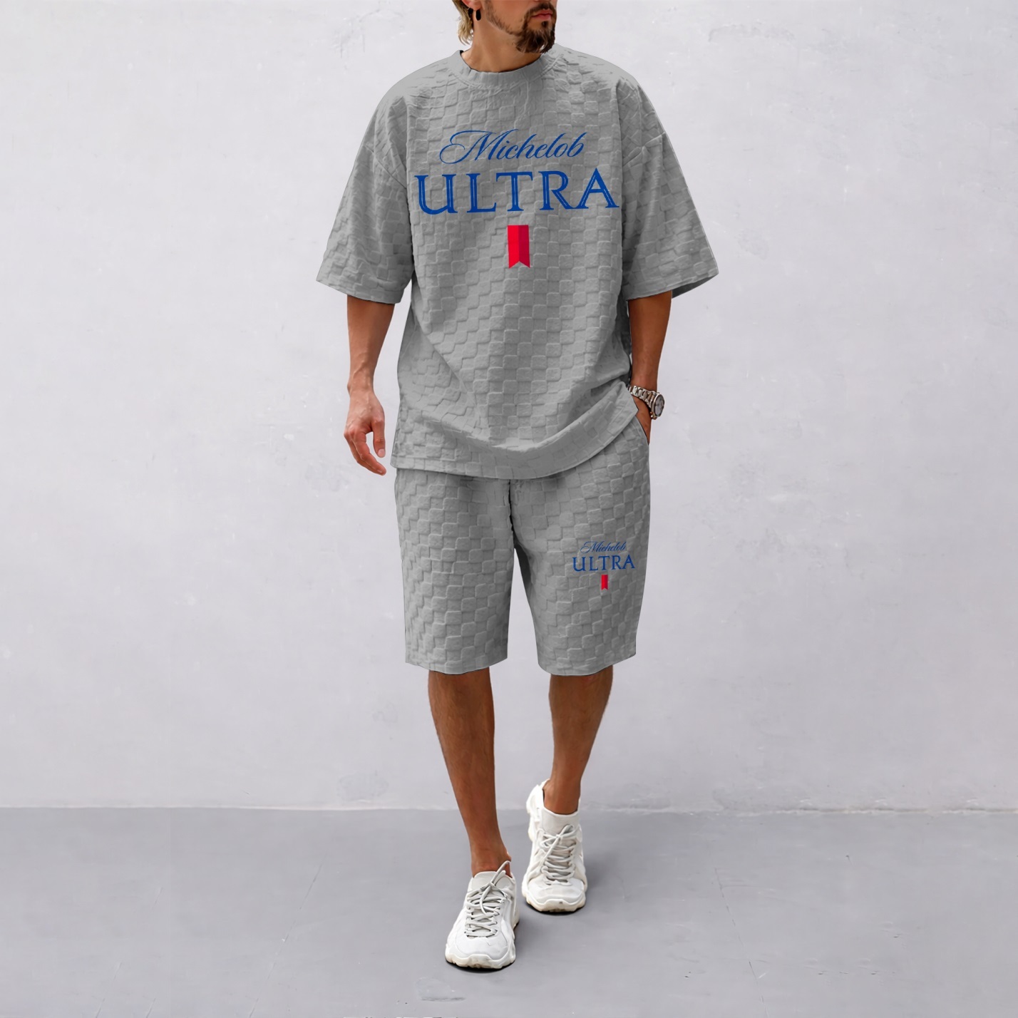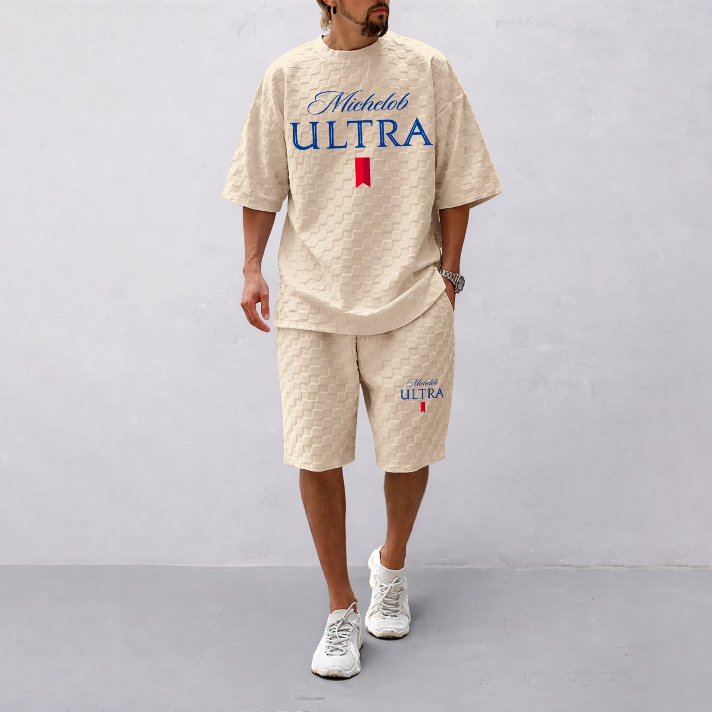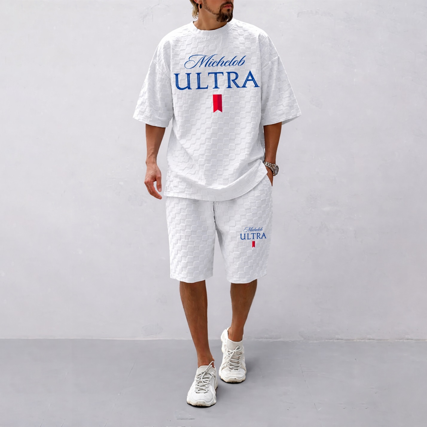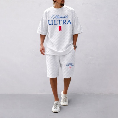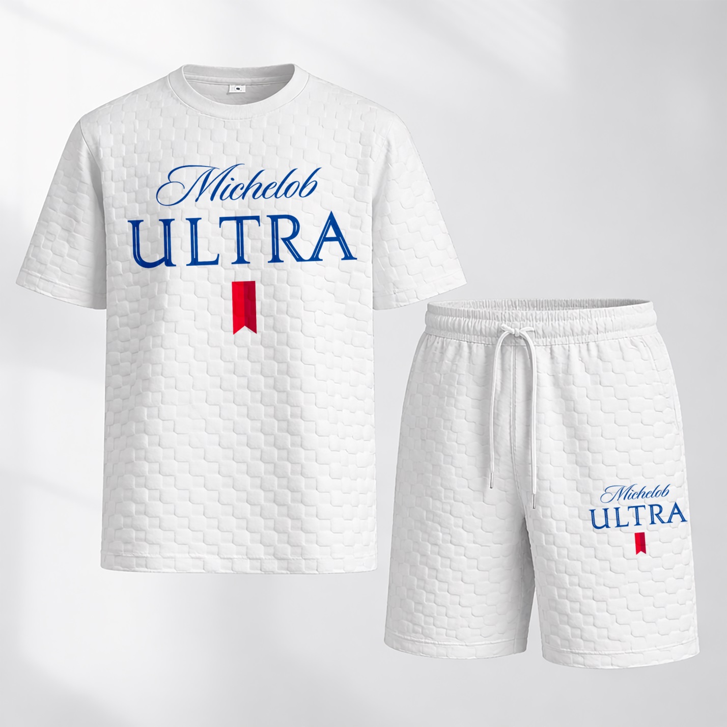 Men's Spring/Summer Drawstring Shorts Set featuring Beverage-Print Plaid Fabric—A casual summer ensemble comprising a short-sleeve shirt and shorts, ideal for both daily wear and athletic activities