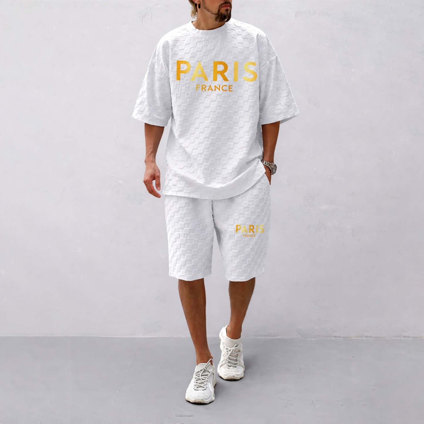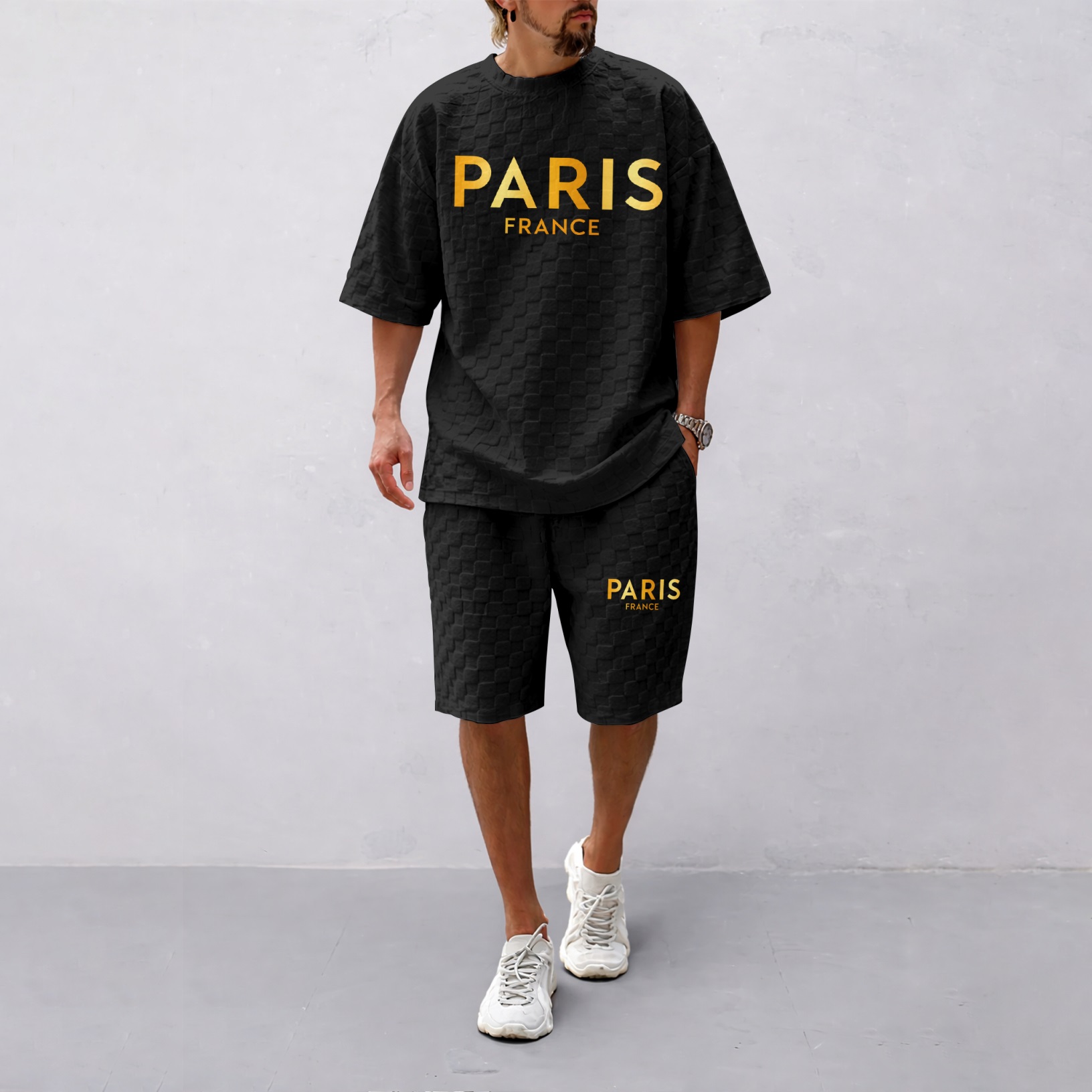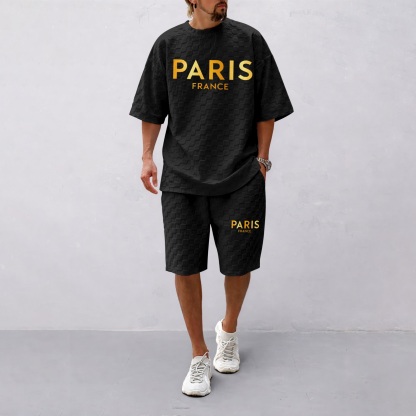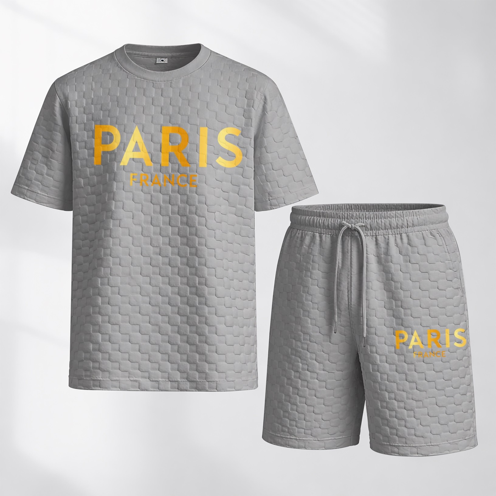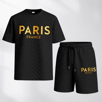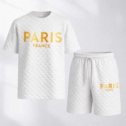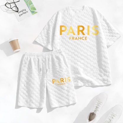 Men's Spring/Summer Drawstring Shorts Set featuring Paris Letter Print and Plaid Fabric—a casual summer ensemble comprising a short-sleeve shirt and shorts, ideal for both everyday wear and athletic activities.