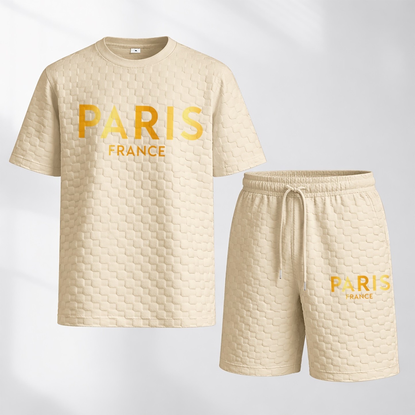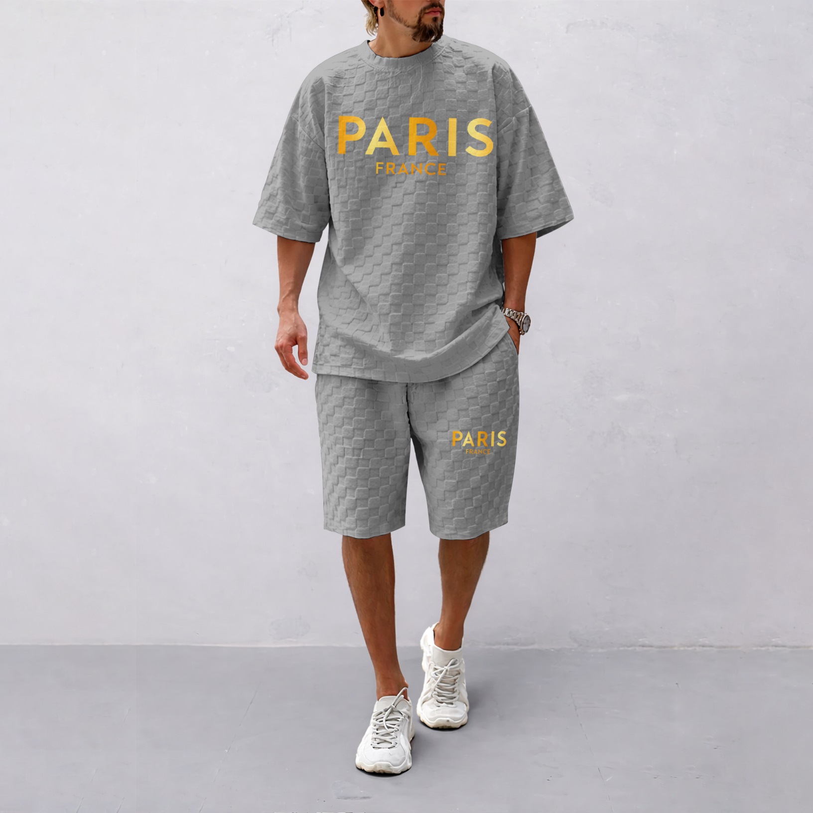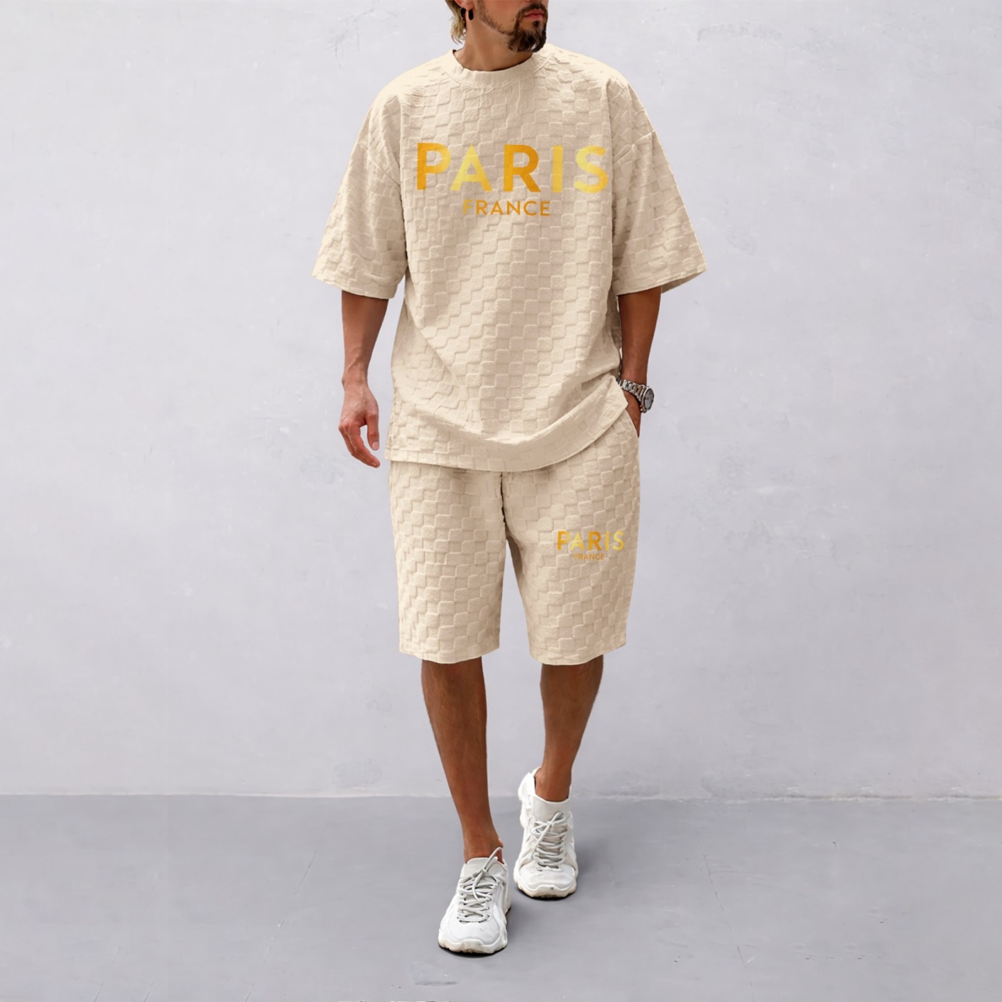 Men's Spring/Summer Drawstring Shorts Set featuring Paris Letter Print and Plaid Fabric—a casual summer ensemble comprising a short-sleeve shirt and shorts, ideal for both everyday wear and athletic activities.