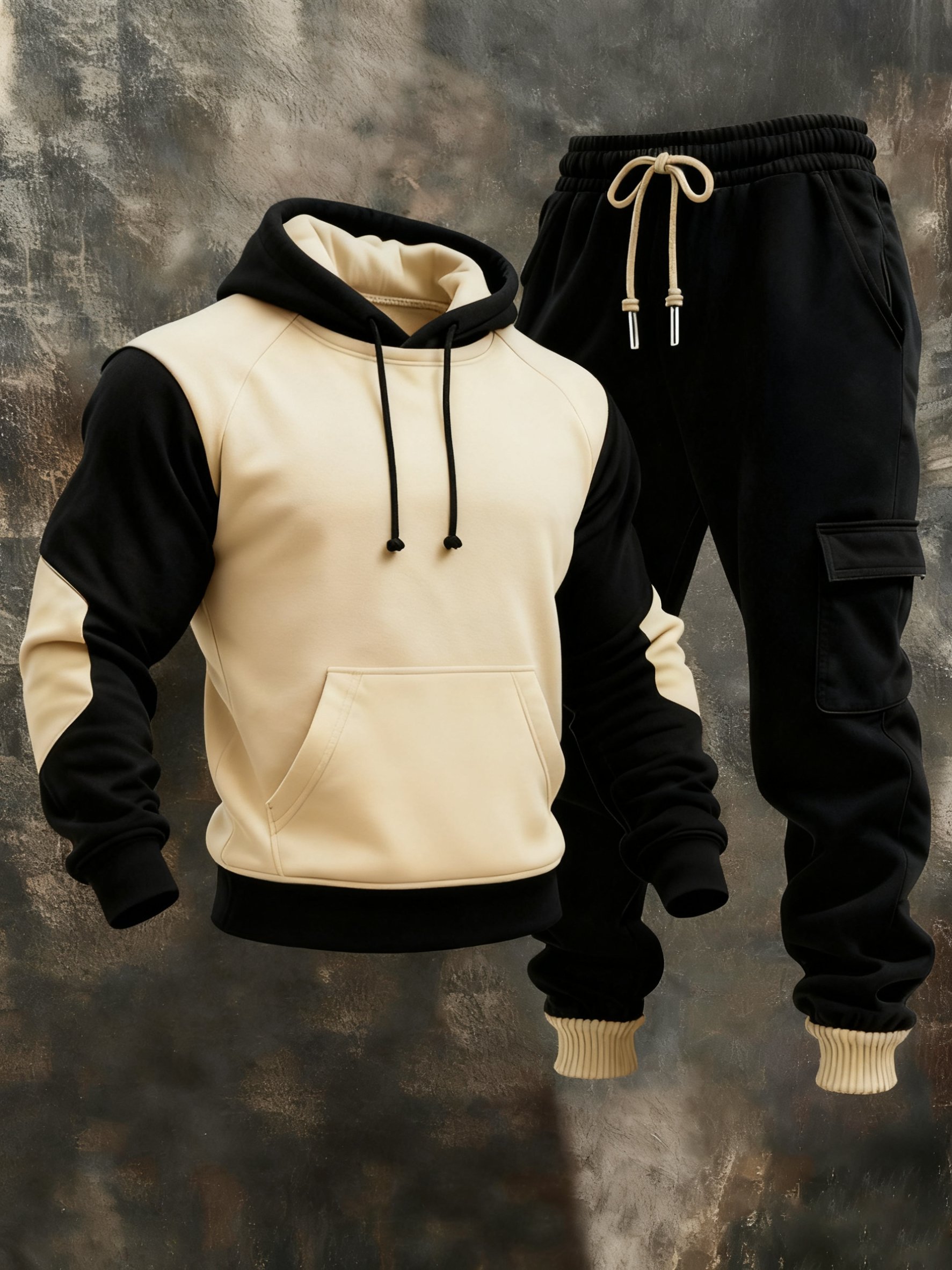Men's Retro Stitching Contrast Color Hooded Casual Sweatshirt Suit