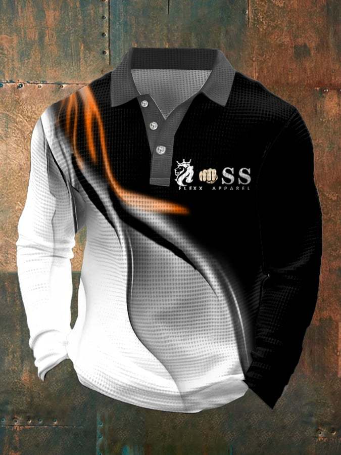 Men's Retro Letter Design Waffle Fabric Long Sleeve Polo Shirt