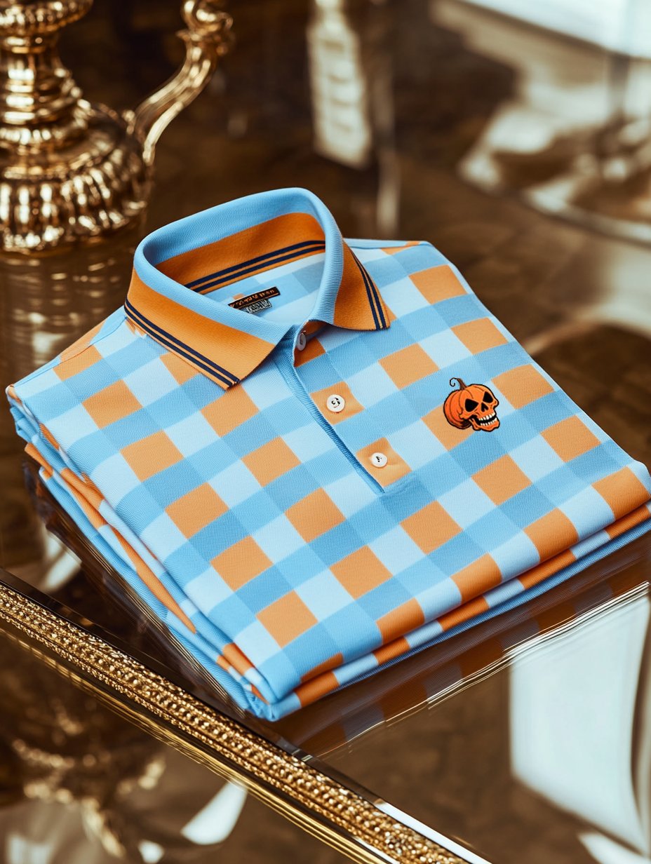 Men's Classic Business Check Halloween Pumpkin Skull Logo Button Short Sleeve Polo Shirt