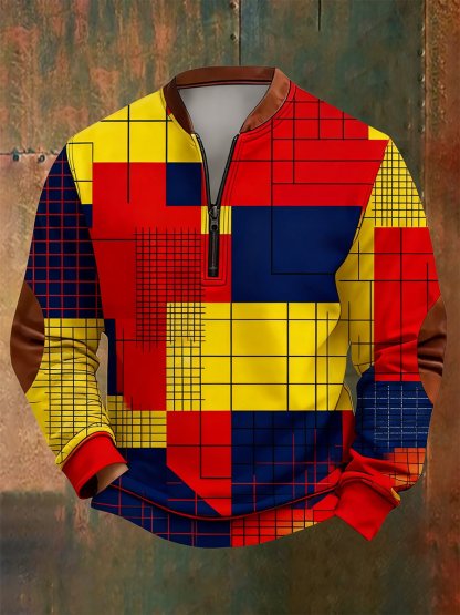 Men's Retro Bauhaus Geometric Style Print Quarter Zip Sweatshirt