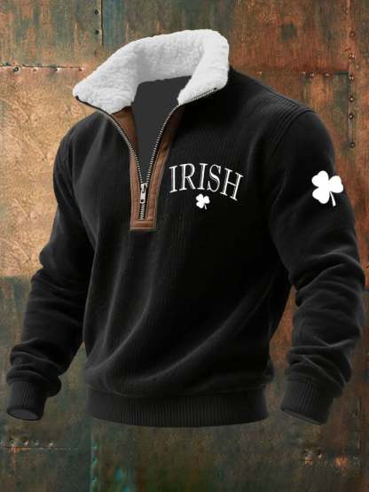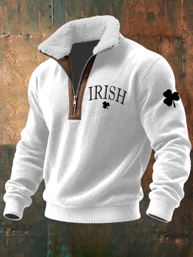Men's St. Patrick's Day Printed Knitted Fabric Zipper Fur Collar Sweatshirt