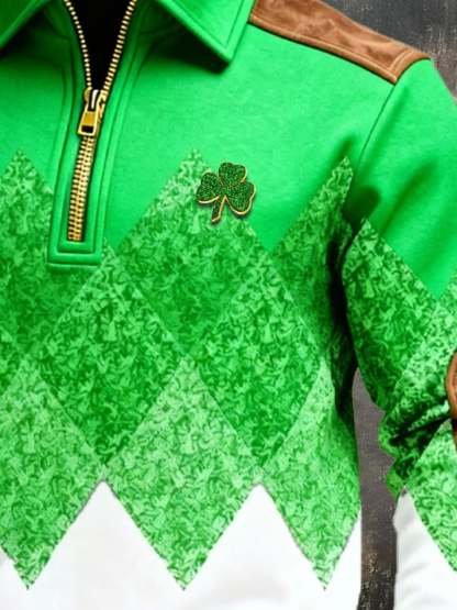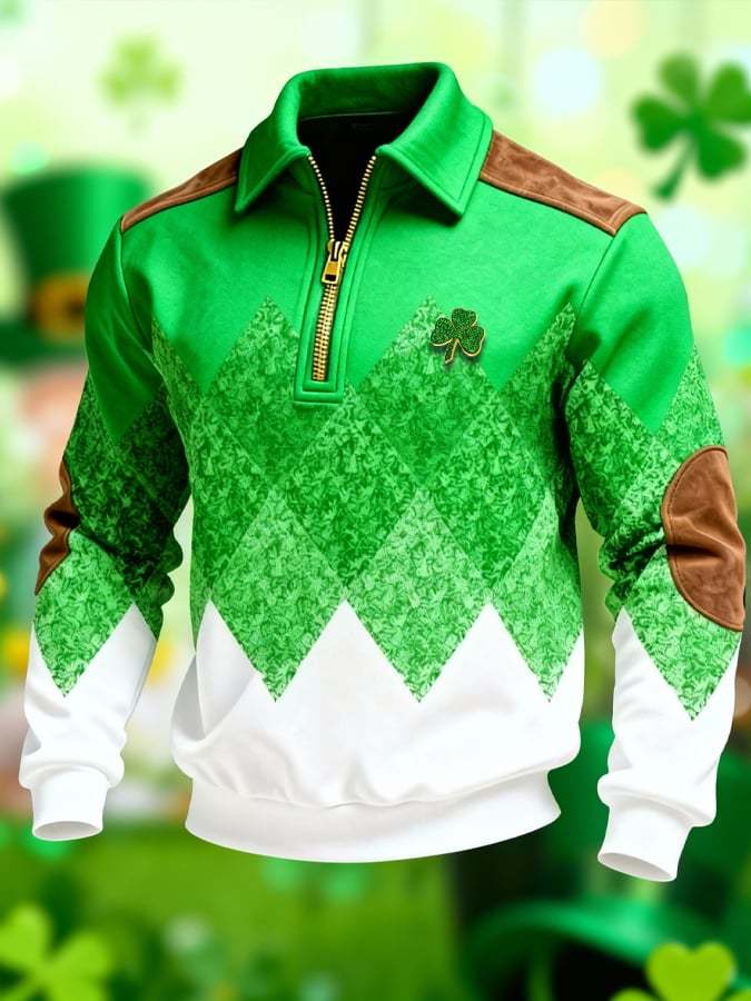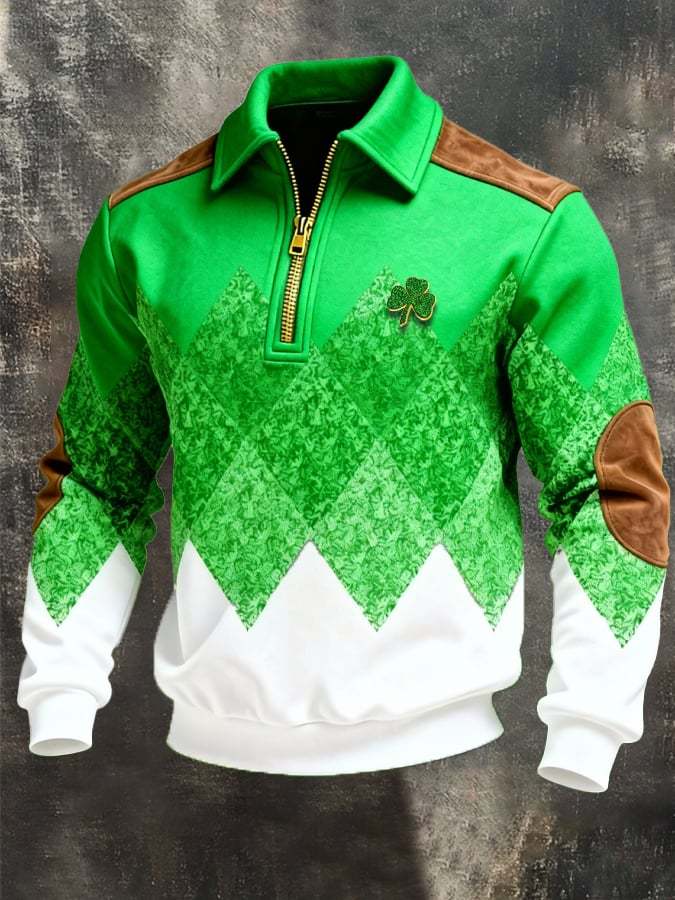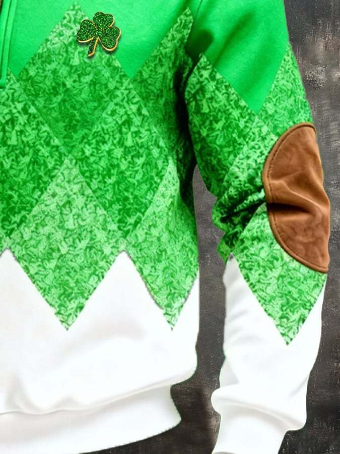 (Detachable Shamrock Brooch Included) Men's St. Patrick's Day Printed Color-Block Zip-Up Hoodie