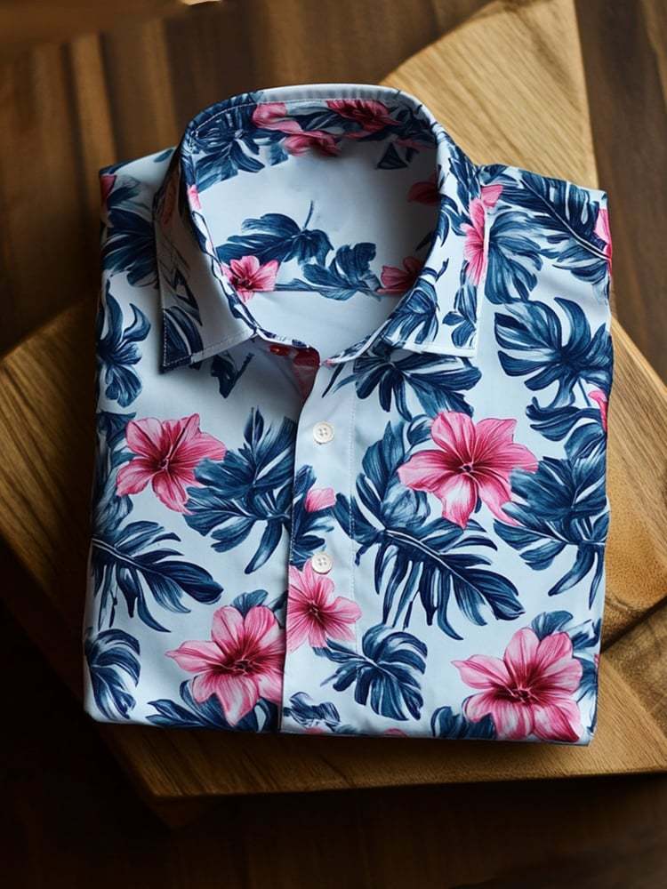 Men's Satin Luxe Hawaiian Floral Leaf Print Short Sleeve Button Shirt