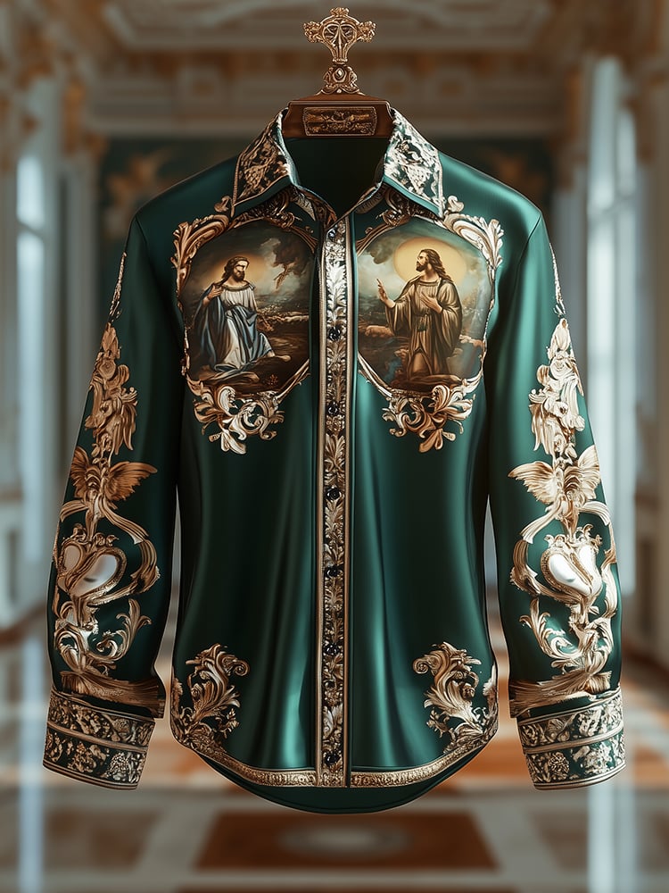 Men's Satin Luxe Saint Michael Archangel Baroque Long Sleeve Button Down Shirt