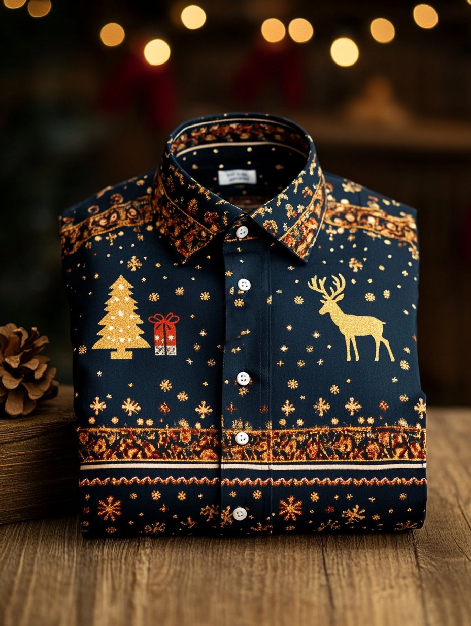 Men's Business Retro Christmas Elk Snowflake Print Long Sleeve Shirt