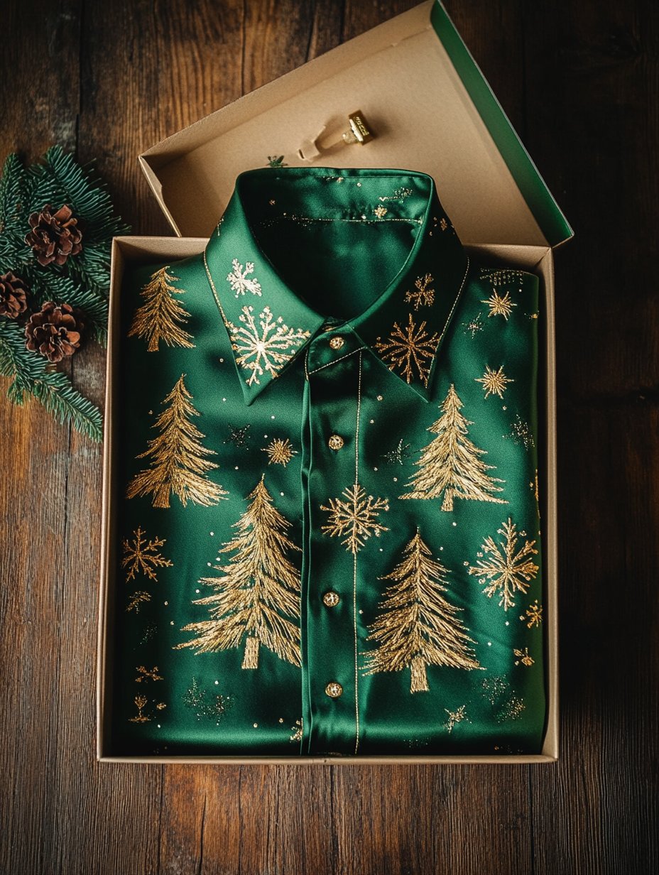 Men's Business Retro Christmas Evergreen Tree Snowflake Print Long Sleeve Shirt