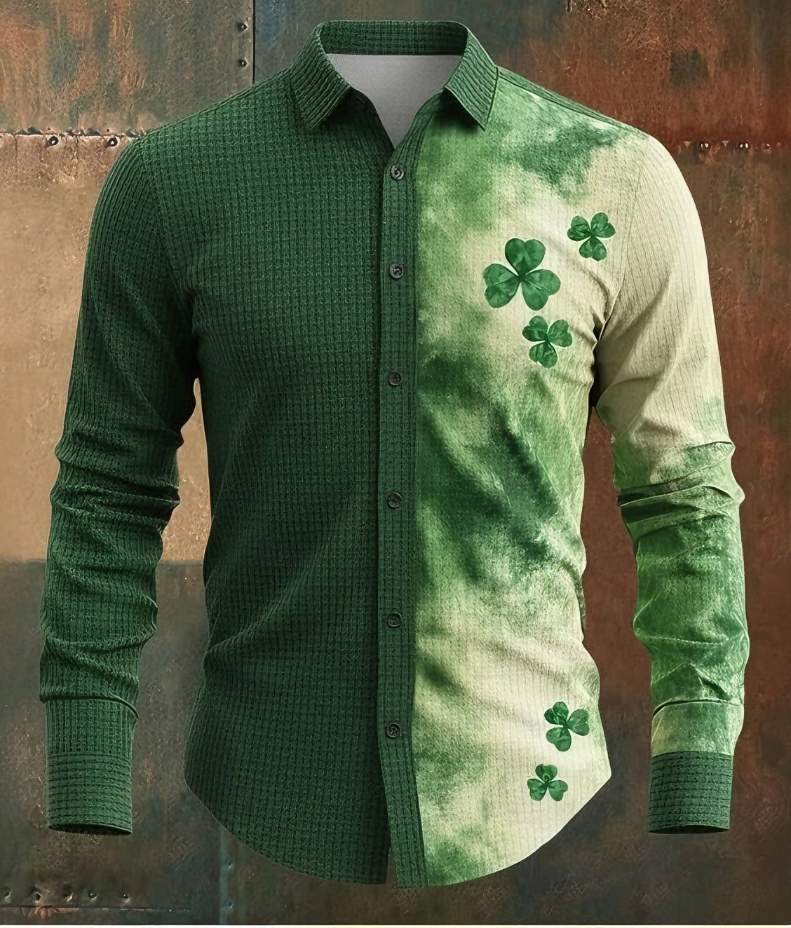 St. Patrick's Day Men's Shamrock Gradient Color Shirt Waffle Shirt Casual Shirt Long Sleeve