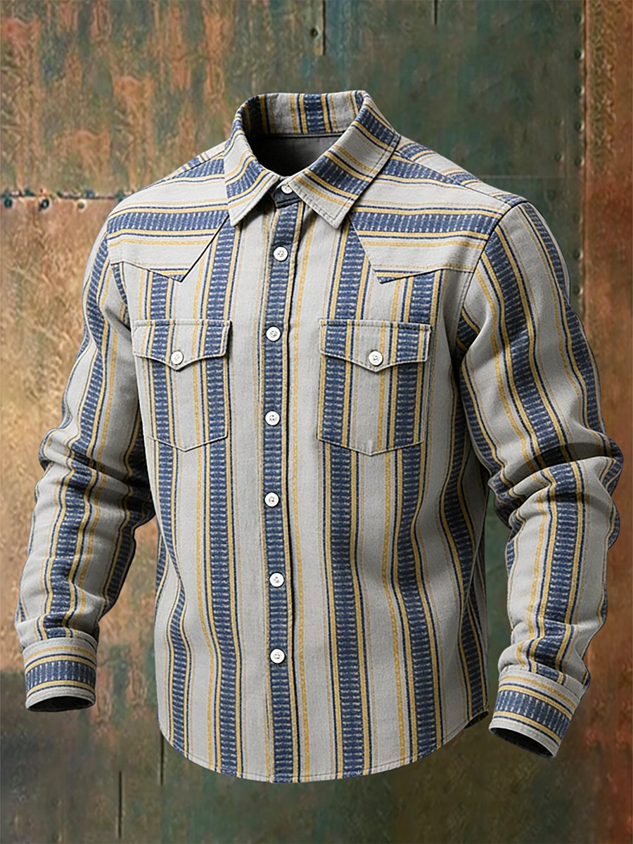 Men's Vintage Striped Western Long-Sleeved Shirt
