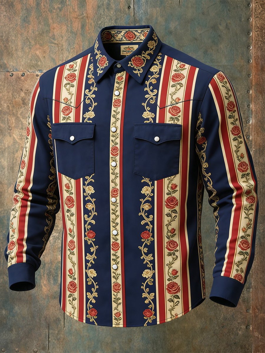Men's Vintage Striped Rose Western Long-Sleeved Shirt