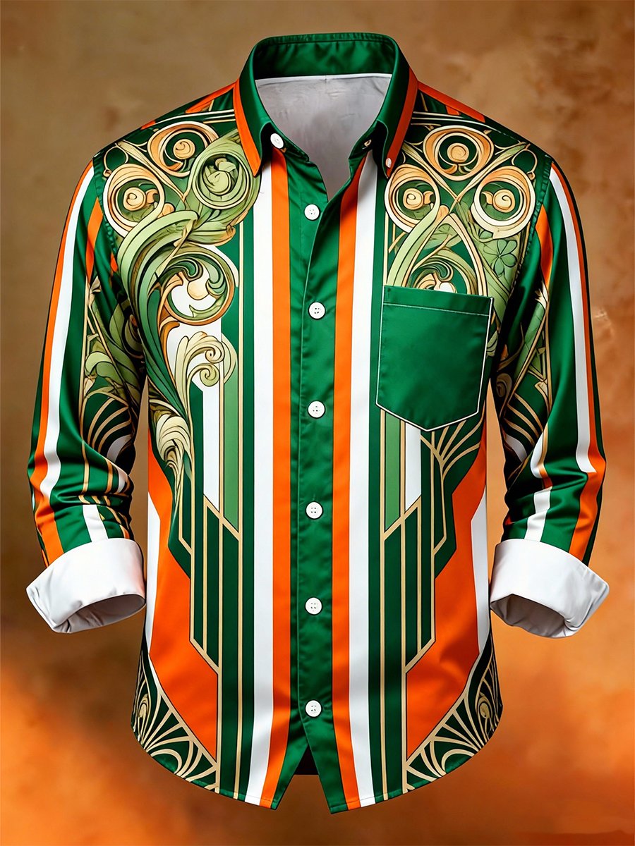 Men's Business Luxury St. Patrick's Day Striped Long-Sleeve Pocket Shirt