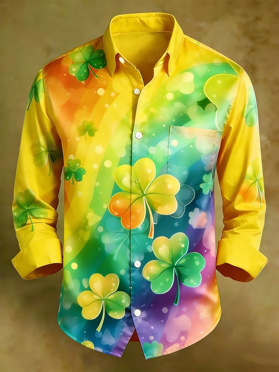Men's Business Luxury St. Patrick's Day Print Long-Sleeve Pocket Shirt