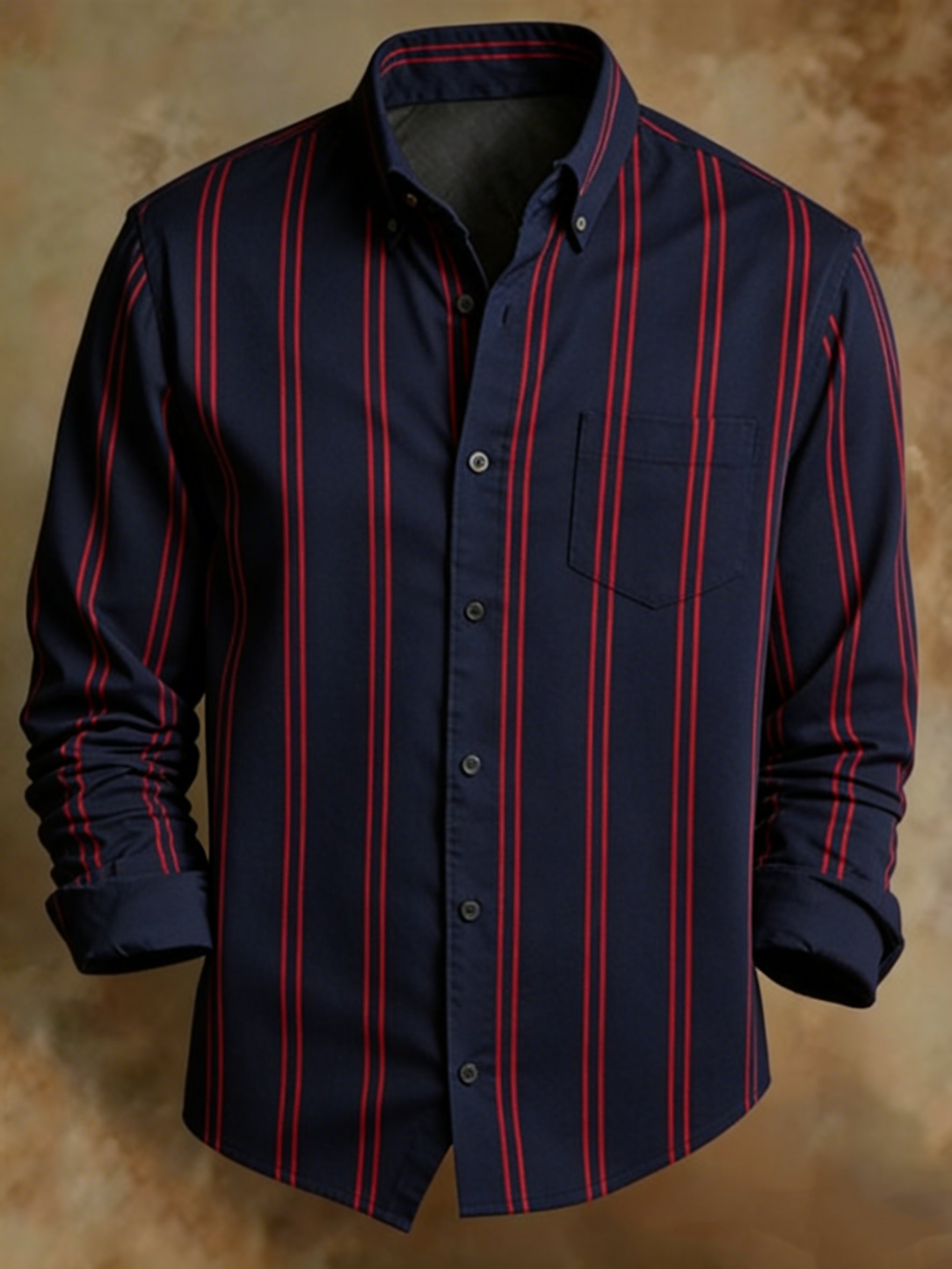 Vintage Style Navy Red Striped Shirt Men's Long Sleeve Casual Business Top