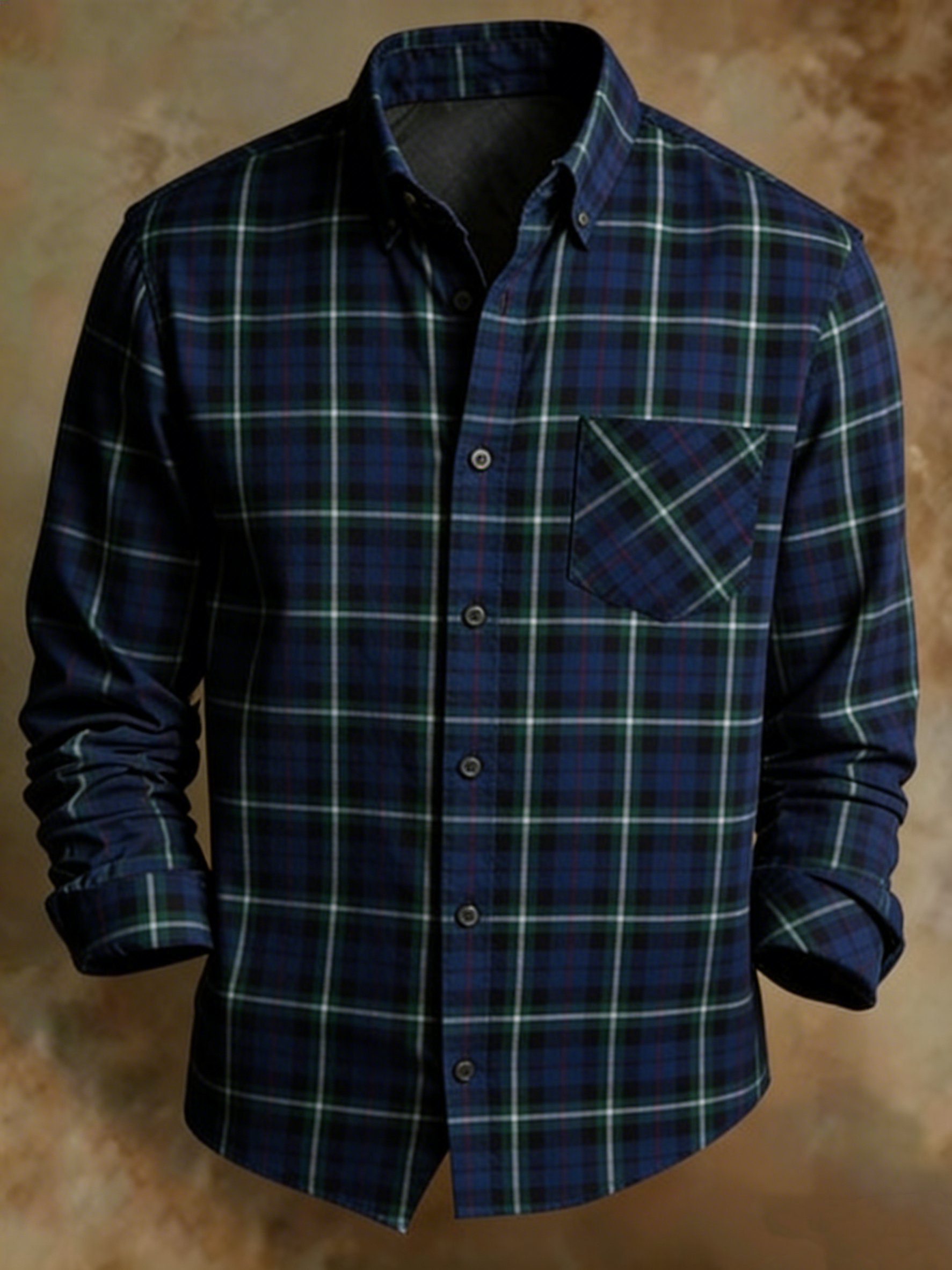 Vintage Style Navy Green Plaid Shirt Men's Long Sleeve Casual Business Shirt