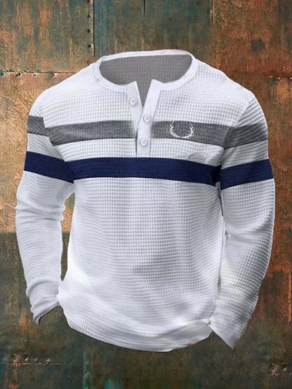 Men's Vintage Waffle Color Patch Henley Neck T-Shirt