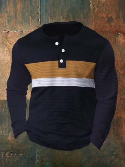Men's Vintage Waffle Color Patch Henley Neck T-Shirt