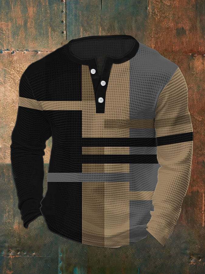 Men's Vintage Casual Henley Waffle Long Sleeve Polo Shirt