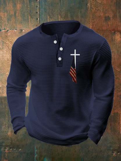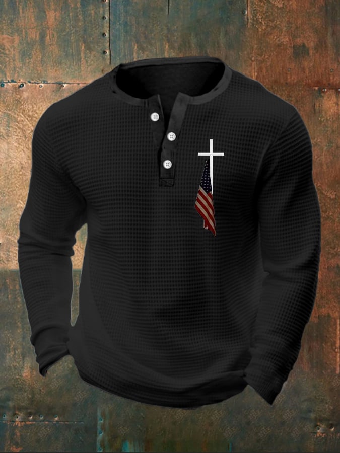 Men's Flag Cross Print Henley Collar Shirt