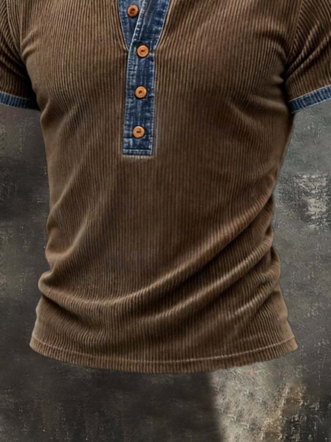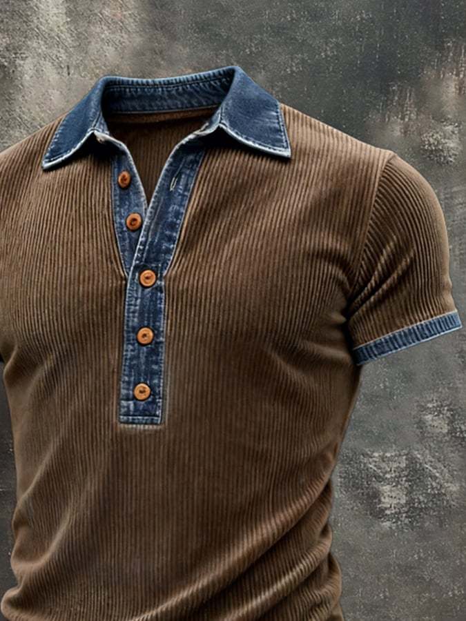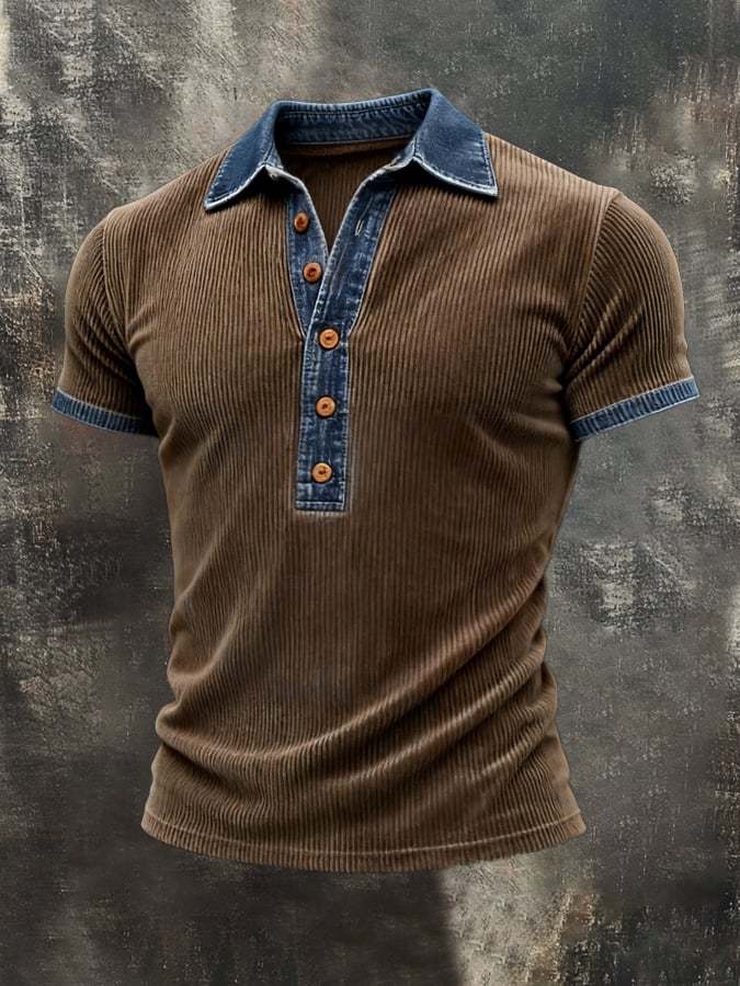 Men's Retro Distressed Patchwork Denim Color Block Short-Sleeve Top