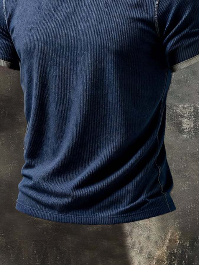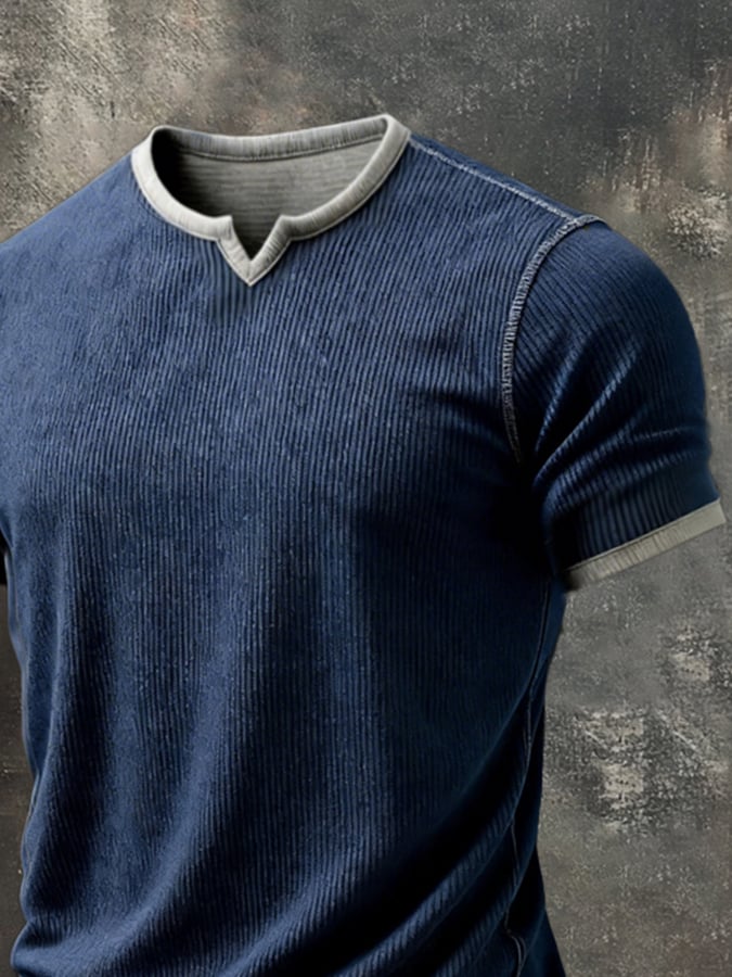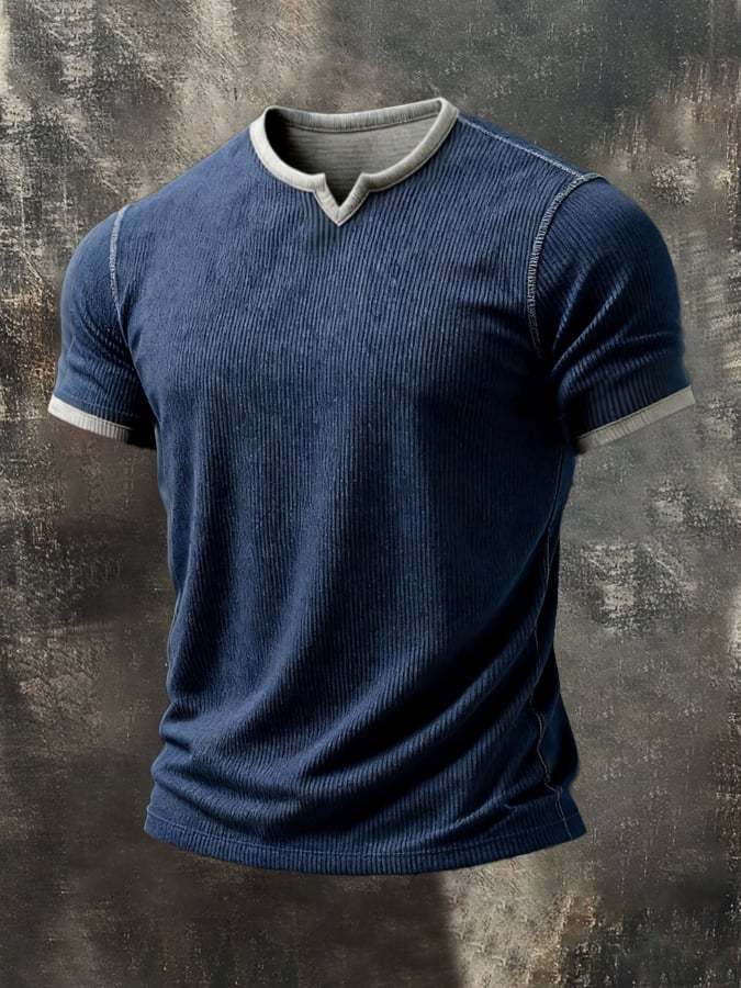 Men's Retro Distressed Patchwork Color Block V-Neck Short-Sleeve Top