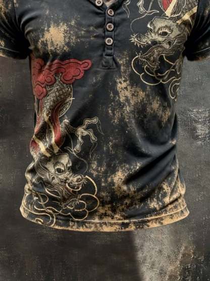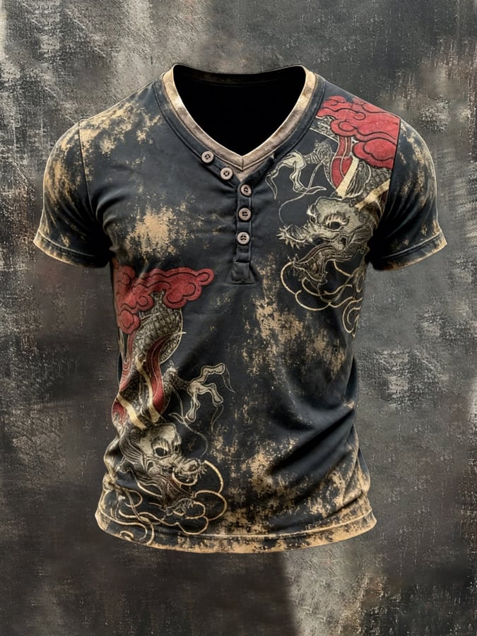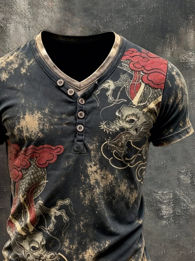 Men's Retro Print Color Block Double-Layer V-Neck Short-Sleeve Top